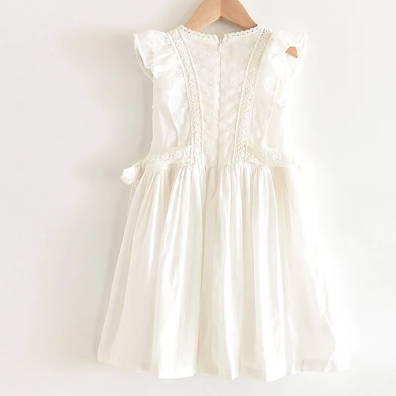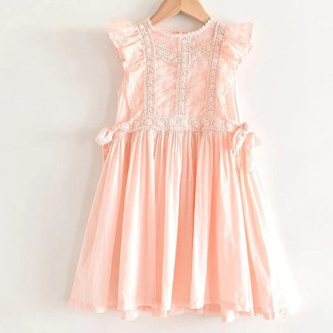Perfect for any special occasions, this beautiful lace embroidery dress features a detailed lace design on its front, ruffles sleeveless, and a ribbon tie on both sides waist. It is soft and comfy to wear.