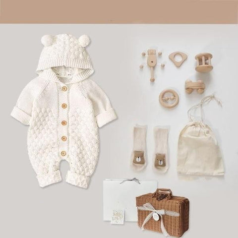 Your little bundle of joy deserves the best. This is a gift that is not just adorable but it's also organic that is very suitable and best for babies. The beautiful new baby gift collection would make the perfect gift for baby shower surprises. It has two sets you can choose from. Each set includes a onesies jumpsuit, wood toys, and socks. It is packed in a beautifully crafted rattan suitcase that you will really adore.